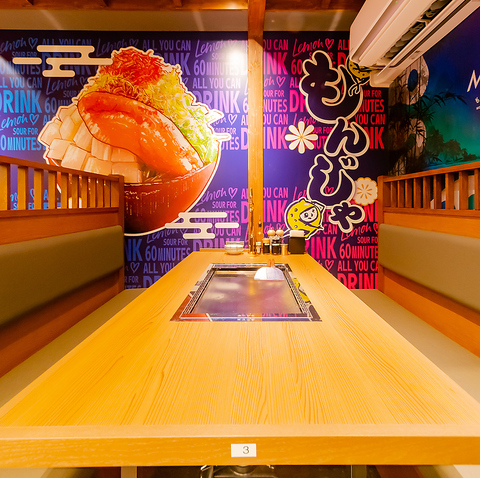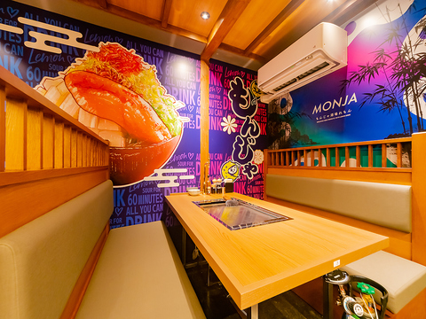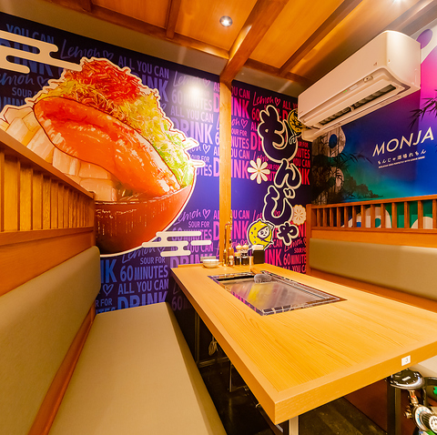 【ワイワイ楽しむ宴会におすすめなスペースがここにあり!】和モダンな内装でSNS映え間違いなし♪もんじゃのイラストとネオン管が惹くデザイン◎みんなで写真を撮ってみよう!