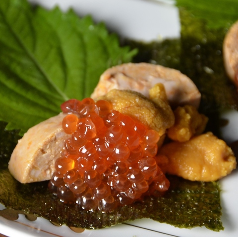 左上から右に、「鮮魚の盛り合わせ」「手巻きのおつまみ ねぎとろわさび」「赤海老のえびしゃぶ」「たまごタルタルのチキン南蛮」「ホタテの海苔の佃煮のカルパッチョ」「カツオの土佐づくり」「手巻きのおつまみ サーモンチーズ」「ソーセージのチーズトッポギ」「いくらおろしだし巻き」