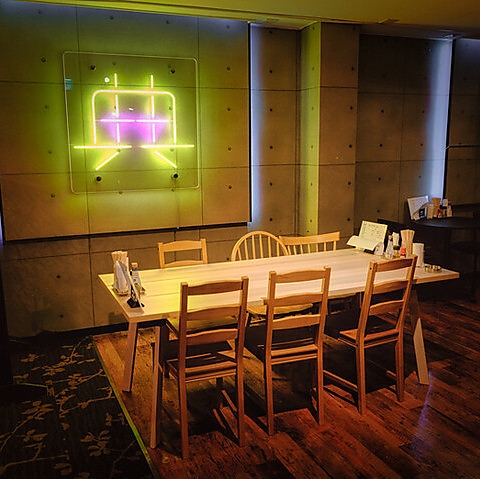 当店のこだわりは、居心地の良さとスタイリッシュなデザインにあります。明るい木のテーブルとシンプルな椅子が揃い、リラックスできる空間を演出。壁面のネオンアートが、温かみのある雰囲気にアクセントを加えています。お客様に特別なひとときを提供するため、心を込めたサービスを心掛けています。