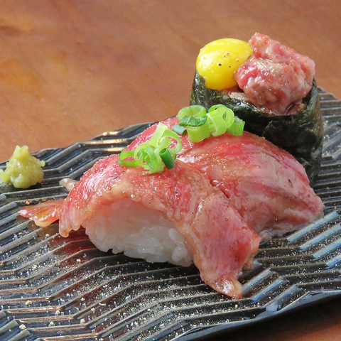 とろけるような赤身肉の旨みがたまらない、大人気の肉寿司!新鮮な赤身肉を贅沢に使い、濃厚な卵黄と合わせれば、口の中で旨みが爆発し、まさにレベルアップ確定の味わいです!見た目も華やかで、冒険の疲れを癒すのにぴったりの逸品。ぜひ一度お試しください!