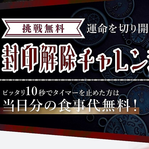 封印解除チャレンジでは、ピッタリ10秒でタイマーを止められた方にその日の食車代を無料で提供します!条件はおひとり様1日1回、食事を先に購入した方のみ。運を試すチャンスをお見逃しなく!あなたの挑戦が美味しい結果をもたらすかもしれません☆