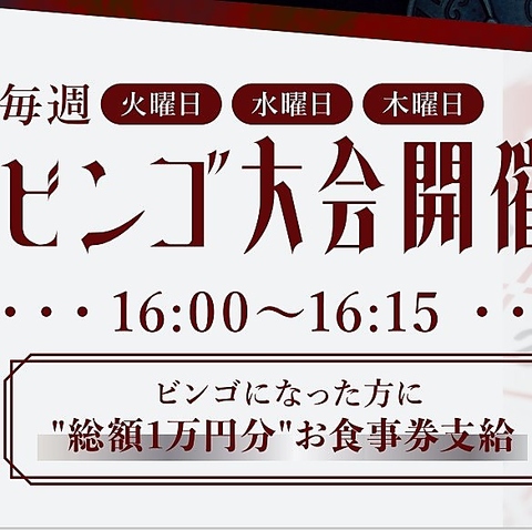 毎週火曜日、水曜日、木曜日の16:00から16:15に行われる「ビンゴ大会」では、ビンゴになった方に嬉しい総額1万円分のお食事券を進呈!ビンゴで運試しをしながら、美味しい食事を楽しむチャンスをお見逃しなく♪多くのご参加をお待ちしています!