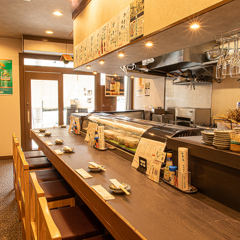 お一人様でも気兼ねなくご利用いただけるカウンター席は、お仕事帰りやサクッと飲みたい時に最適です。目の前のネタケースには新鮮な旬の魚介が並び、職人の技を間近でご覧いただけます。お好みのお酒とともに、ゆったりとした時間をお過ごしください。
