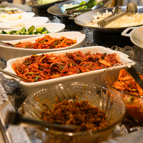こだわりの自家製キムチ4種・ナムル類・サラダ類・沖縄そば・ビーフカレー・ご飯・サムギョプサルのトッピング野菜や焼き野菜が食べ放題!!/小学生半額・幼児無料/お酒を飲むお客様はキムチをおつまみにも!