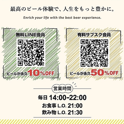 無料のアプリ会員になると、ビールがいつでも5%~最大15OFFに!さらに有料のサブスク会員になると、なんとビールが常時50%OFF!お得に楽しめるチャンスです!