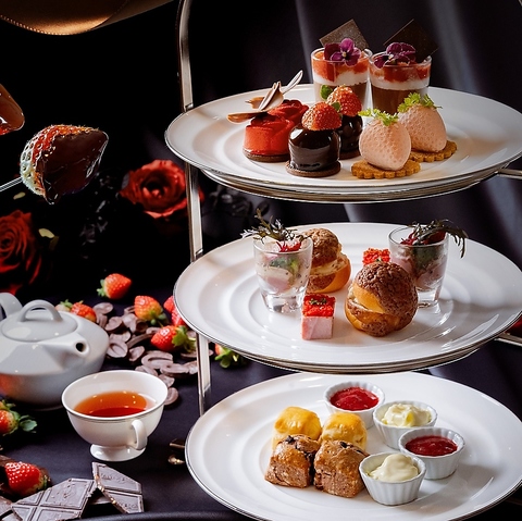 アフタヌーンティには4種類のスイーツ&3種類のセイボリーに加えてチョコレートフォンデュがセット!とろけるチョコレートといちごを心行くまで堪能できます。