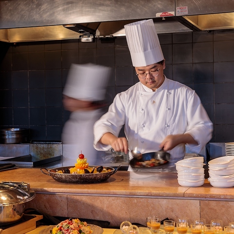 一流のシェフが目の前で料理する様子を楽しめるライブステーションがあり、臨場感も満点!ローストビーフは目の前でスライスしてご提供!もちろん食べ放題です♪