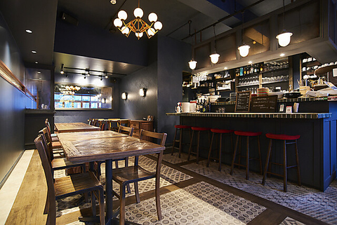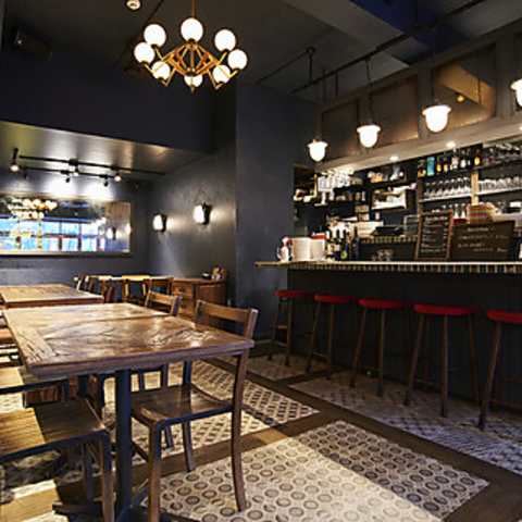 開放感ある扉から一歩足を踏み入れると、ダークブルーを基調としたシックな空間が広がります。個性的な布張りの椅子やアンティーク調のウッドテーブル、カウンターのタイル使いなど細部に至るまでにこだわり尽くした店内。立食時最大40名様での貸切も可能です◎ご利用などお気軽にご相談ください♪