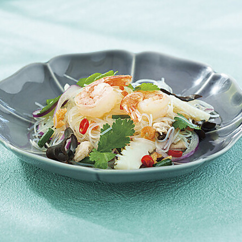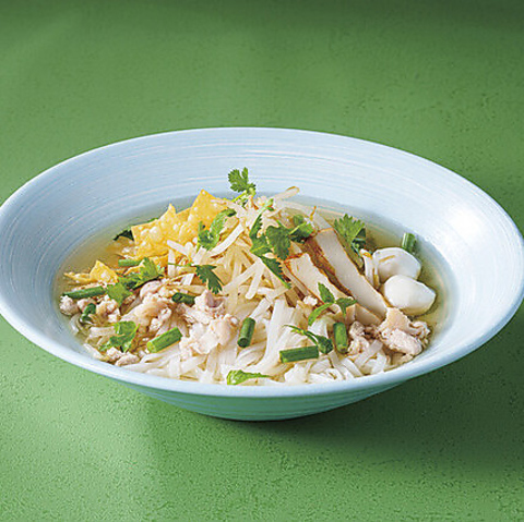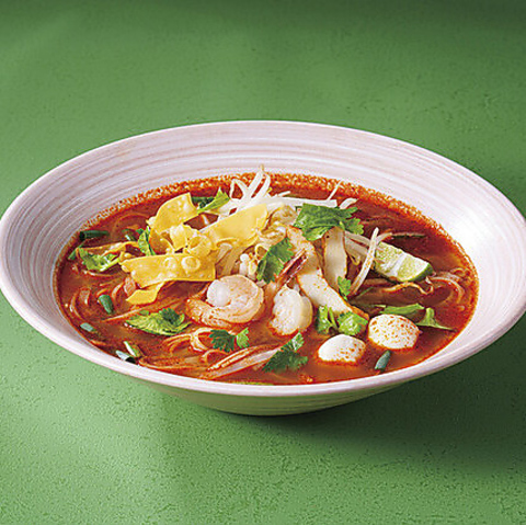 海老入りのヌードルは、特製のトムヤムクンスープが魅力です。「甘・辛・酸」のバランスに加え、牛乳が入ったことでまろやかさが際立ち、奥深い味わいが楽しめます。オリジナルの生米麺は、スープとの絡みが良く、食感も楽しめる一品。海老の旨味とスパイスが絶妙に調和し、タイ料理の真髄を感じられる贅沢なヌードルです。