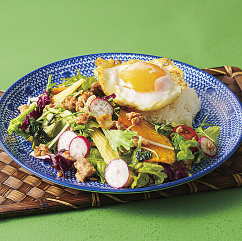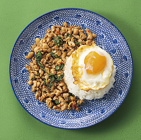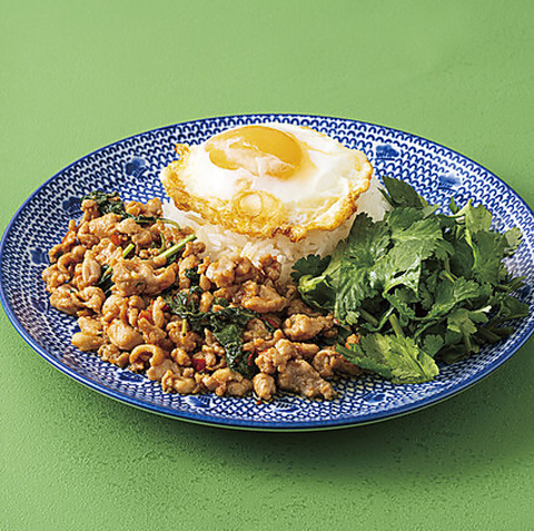 マンゴツリーの一押しガパオは、彩り豊かな新鮮な野菜とジューシーな鶏挽き肉を絶妙に炒めた一品です。香ばしいバジルの香りが食欲をそそり、目玉焼きがトッピングされ、食感と風味のバランスが楽しめます。ご飯との相性も抜群で、満足感のある美味しさです。