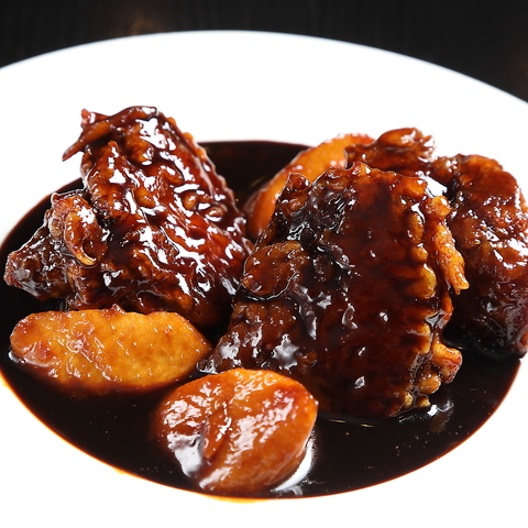 黒酢を使用した甘酸っぱいこだわりのタレで豚の角煮とお野菜を煮込んだ当店自信の逸品です。豚の角煮は柔らかくなるまでじっくりと煮込み、幅広い世代に食べやすく仕上げました。ご飯がすすむのはもちろん、厳選して取り揃えたお酒の数々との相性も抜群です☆