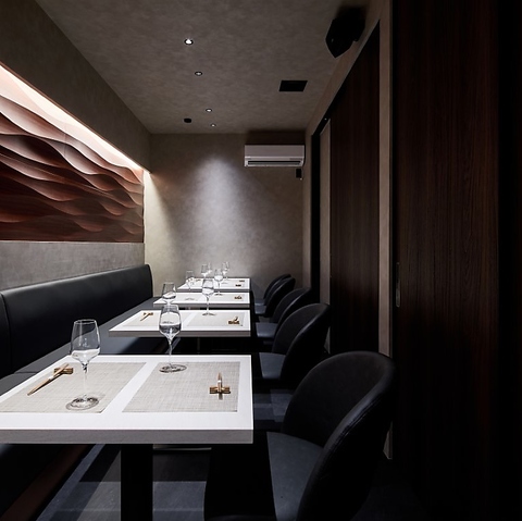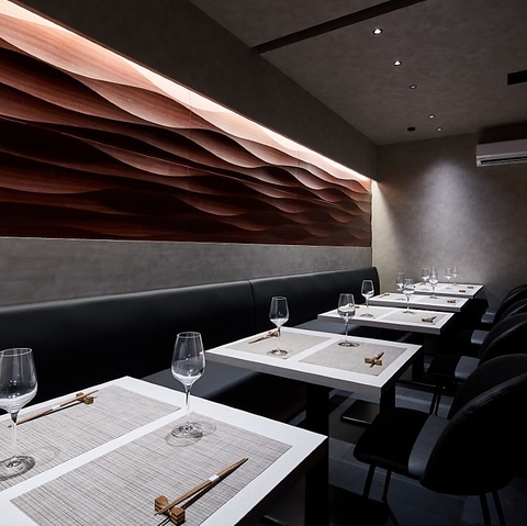 石や黒を基調とした落ち着いたテーブル席は、4名程度のグループにちょうど良い配置。料理を囲みながらゆったり語れる空間で、友人との会食や記念日利用にも向いています。