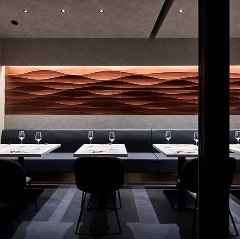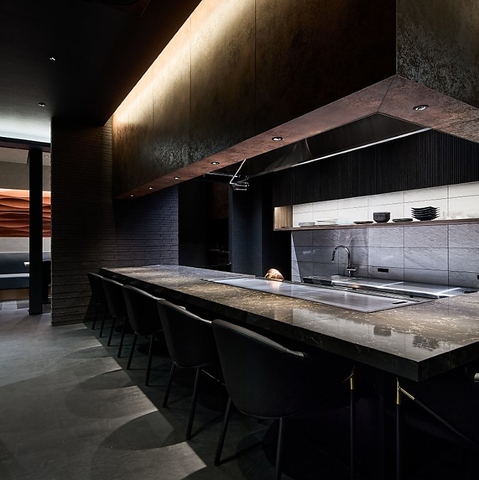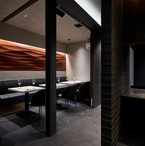黒を基調にした内装に、石目調の壁や重厚なカウンターが映えるモダンな空間。ほんのりオレンジがかった間接照明が、ディナータイムに上質な落ち着きを添えます。テーブル席や半個室はロールカーテンで柔らかく仕切られ、昼と夜で雰囲気を変える演出が魅力です