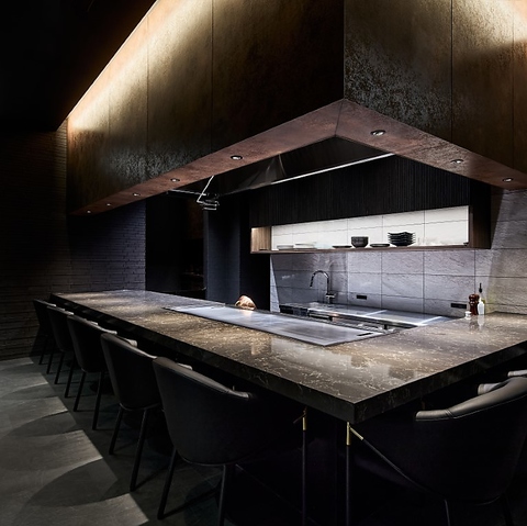 店内は昼と夜で異なる表情を見せ、ランチは自然光が心地よく、ディナーは間接照明が落ち着いた雰囲気を演出。一枚板の石カウンターや黒壁に映えるオレンジがかった照明など、上質な素材と設計の工夫が光ります。大人の時間をゆっくりと楽しめる空間です。