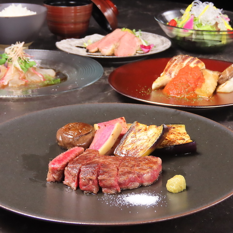 黒毛和牛ステーキを主役に、鮮魚や焼き野菜、デザートまで幅広く楽しめます。伊勢海老や鮑が加わる上位コースでは、より豪華で記念日や会食にも最適な内容に。生の伊勢海老は鉄板で香ばしく焼き上げ、華やかな盛り付けとともにご提供します。食材の旨みを引き出す丁寧な火入れと、見た目の美しさも魅力のひとつです。