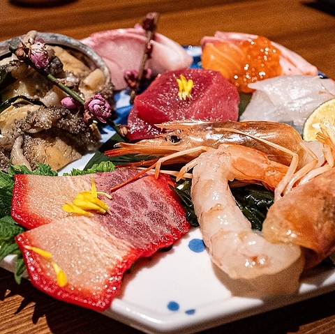 魚の美味しいと感じる要素の「見た目、香り、食感、味、余韻」を最大限に引き出した鮮魚をご堪能いただけます◇器にもこだわり、目で見てもお楽しみいただけます。海鮮と言えば日本酒。厳選した日本酒などと共に是非ご堪能ください。