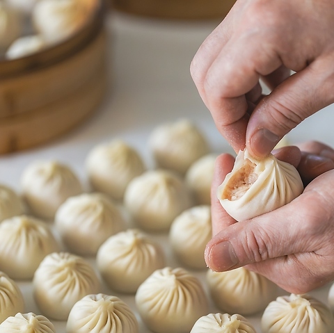 皮は秘伝配合の小麦粉を店舗で練り上げます。一口で溢れ出すスープは8時間煮出したコラーゲンたっぷり!手作りの小籠包をお楽しみいただけます。