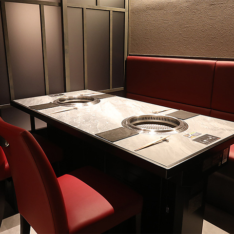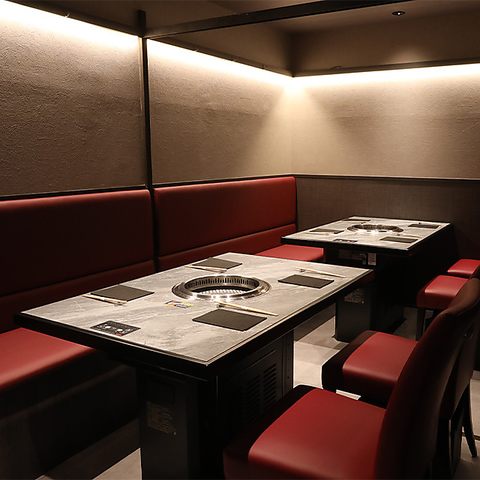 個室をご用意。卓上のガスロースターでお客様自ら焼くスタイルのお食事を楽しめます。しっかりと換気しておりますので、煙や匂いを気にせず食事を楽しめるのもうれしいポイントです。