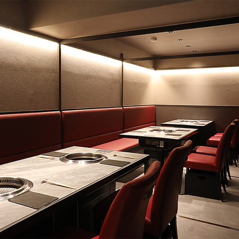 利用シーンに応じて選べる完全個室を完備しております。、和の趣にモダンな感性を取り入れた上質な店内。肉が誘う“恍惚の食体験”に心を傾けていただけるよう、絶妙なタイミングで提供。誰もが心揺さぶられる、“口福”という名の美食体験がここにございます。