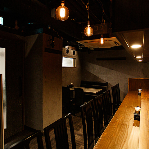 神戸三宮で店を構えるのは店主の地元だから。場所は東門街南側のすぐ目の前、駅からも近い最高の立地であなたに最高のひと時をお届けします。照明を抑えた店内は少し暗いですが大人の隠れ家としてデートにぴったりです。テーブル席もご用意しており飲み会も◎!8名~半個室を全て使えるので、宴会時も周りを気にせずお楽しみいただけます。