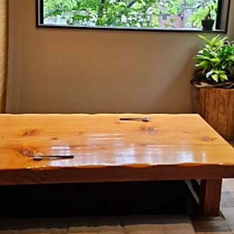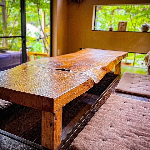 ゆったりとした時間を過ごすのに最適な空間です。足をのばせる設計が、くつろぎをもたらし、心身ともにリラックスできます。温かみのある木のテーブルと柔らかな座布団が心地よく、自然の光を感じながら、穏やかなひとときを過ごしましょう。