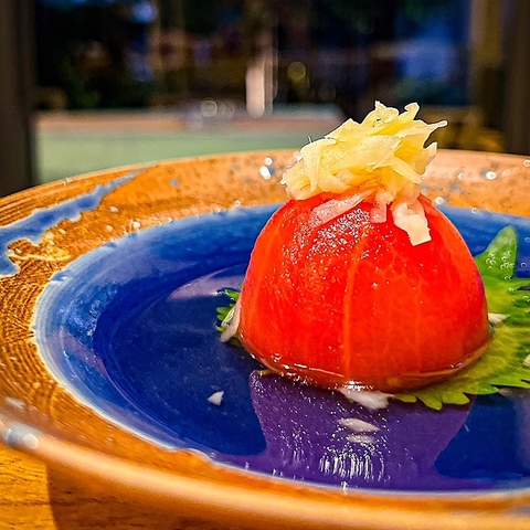 様々なおつまみメニューが美しく盛り付けられています。色鮮やかな皿に乗せられた料理は、目にも楽しく、食欲をそそります。繊細な盛り付けが、料理の味わいを引き立て、特別な食事のひとときを演出しています。