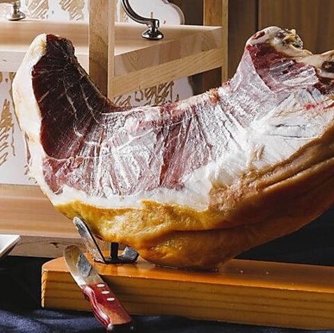 【OPEN特典】事前席のみ予約限定で通常価格1650円⇒特別価格990円(税込)にてご注文頂けます!本場スペインの骨付き原木生ハムをシェフが専用カウンターでオーダーが入ってからその都度、丁寧にスライスカットしてご提供します。