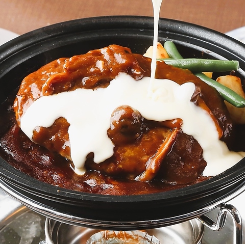 Galician Pork hamburg《特製デミグラスとチーズの2色ソース》栗を食べて育ったスペイン産のガリシア栗豚のハンバーグをご賞味ください。キノコと野菜をトッピングしてたっぷりの特製ソースで仕上げたお昼の人気メニューです。
