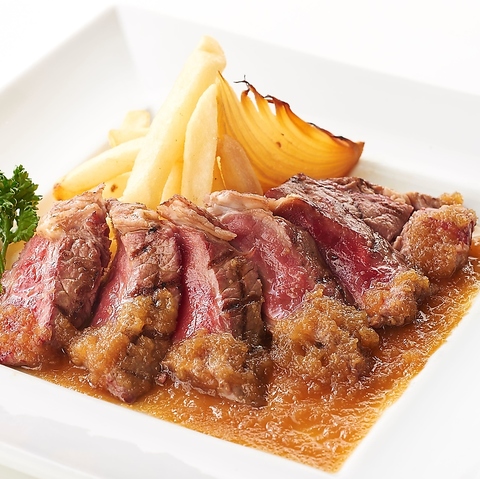 Spanish Beef skirt steak《黒胡椒香る赤ワインソースor特製シャリアピンソース》 牛1頭から2kgしか取れない貴重な部位。脂肪が少ないお肉で比較的あっさりと食べれるのが特徴です。赤ワインソースまたは、シャリアピンソースよりお選びください。