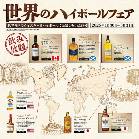 1月30日(金)~3月31日(火)の期間、【世界のハイボールフェア】を開催しております。世界各国を代表するウイスキーが、神戸クック・ワールドビュッフェに大集合!!アルコール飲み放題「1,430円(税込)」に追加料金なしで、世界のハイボールが好きなだけ楽しめる超お得なフェア♪