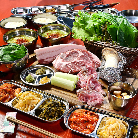 鹿児島県産の黒豚を贅沢に使用した本格サムギョプサルコース。旨みたっぷりの極厚豚バラを、香ばしく焼いて、旬の包み野菜とともにお召し上がりください♪ピリ辛の薬味と韓国だれが食欲をそそる、満足度抜群の本格グルメです。