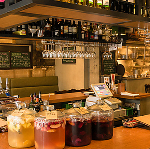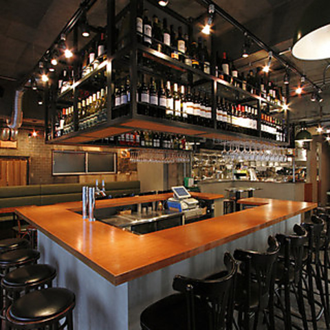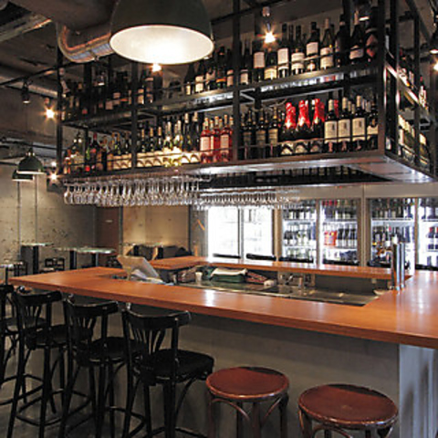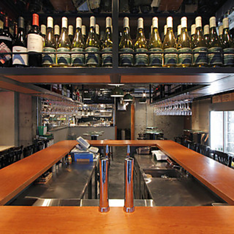 豊富なワインが並ぶカウンターは、料理と共にお好みのドリンクを楽しむのにぴったり。おしゃれな空間でお食事を♪