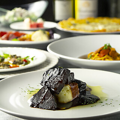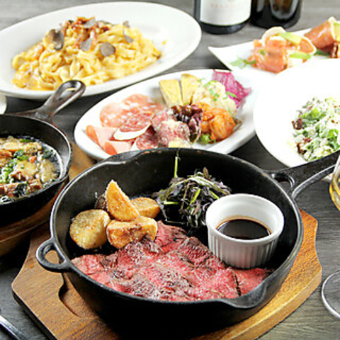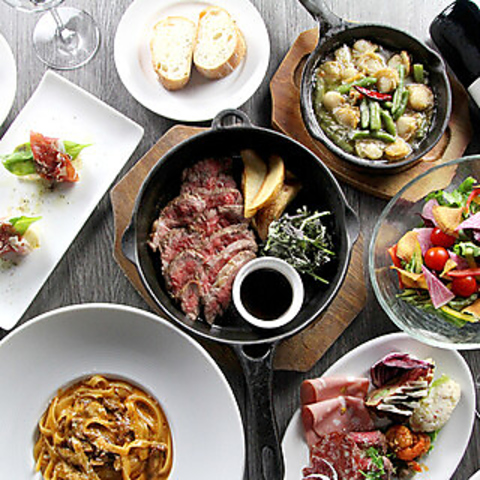 2時間飲み放題付き/アンガス牛ランプのステーキをメインディッシュとし、ポルチーニ茸のトマトクリームパスタやアヒージョ・前菜盛合わせなど充実した料理内容。飲み放題メニューは豊富な30種類以上。デートや会社同僚・友人など幅広いご利用に最適です