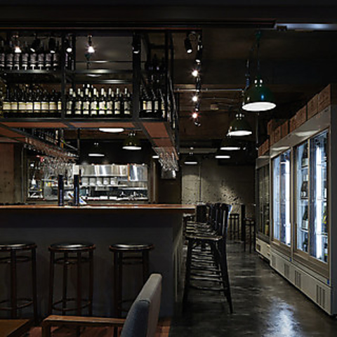 全面オープンに出来る開放的空間です。テラス席にはソファー席と、立ち飲みテーブルを完備。店内中央のドリンクカウンター席も夜風を感じながら、お食事・ワインをお楽しみいただけます。