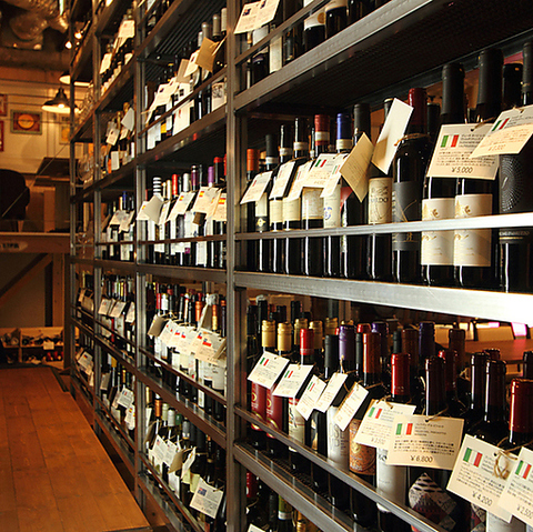 階段を上り店内へ入ると圧巻のワイン棚とワインセラー。ワイン棚にズラリと並んだワインは原産国・品種・味わいの異なる500種以上、現物を見ながら選び楽しむことができます。お客様のその日その時の気分にぴったりな1本と必ず出会えます。
