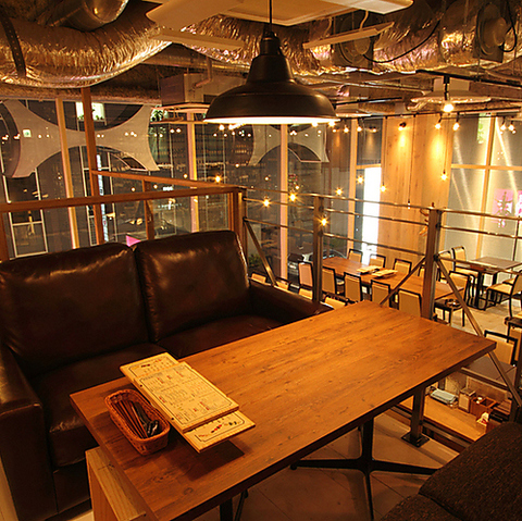 【スタイリッシュな店内】天井が高い店内にはガラス越しに通りを見渡せる開放感あるメインフロアやガラス張りの個室席、ステップフロアの中二階席は店内を見渡せるソファー席も完備しております。普段使いはもちろん、パーティーやご宴会にも是非!