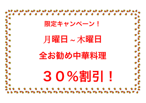 月曜日~木曜日全おすすめ中華料理30%割引!