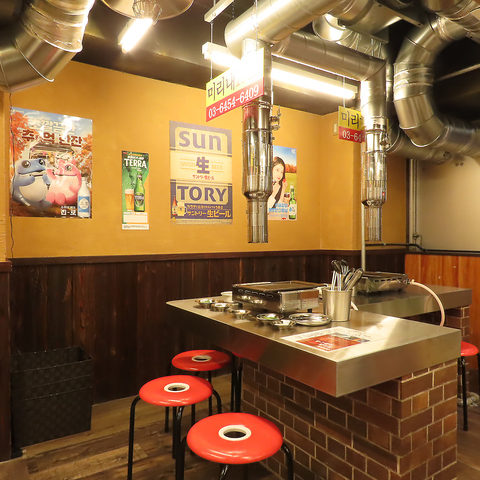 【カウンター席がメイン席】各テーブルでスタッフが目の前で調理♪ライブ感と会話も楽しめるのが魅力!最高の状態で食べられるお肉!本場韓国を再現した店内で、ホルモン焼肉をお楽しみいただけます!