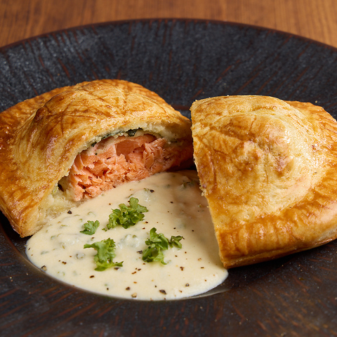 脂ののったサーモンとほうれん草を、なめらかなホワイトマッシュポテトとともにサクサクのパイで包みました。優しい味わいと香ばしいパイの食感が楽しめます。
