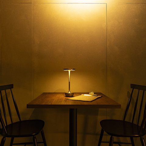 壁に設置されたスタイリッシュな照明がアクセントになったテーブル席は、洗練された雰囲気が魅力です。隣のテーブルとの間隔もゆったりと確保されており、プライベート感を保ちながらお食事をお楽しみいただけます。日常使いから特別な日まで、様々なシーンでご利用ください。