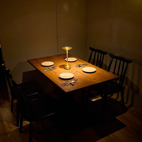 しっとりと落ち着いた雰囲気の4名様個室は、大切な方との特別な時間を過ごすのに最適な空間です。テーブルに置かれた暖かな光を放つランプが優しく灯り、プライベートな雰囲気を一層高めます。フレンチの繊細な料理と共に、記憶に残るひとときをお過ごしください。