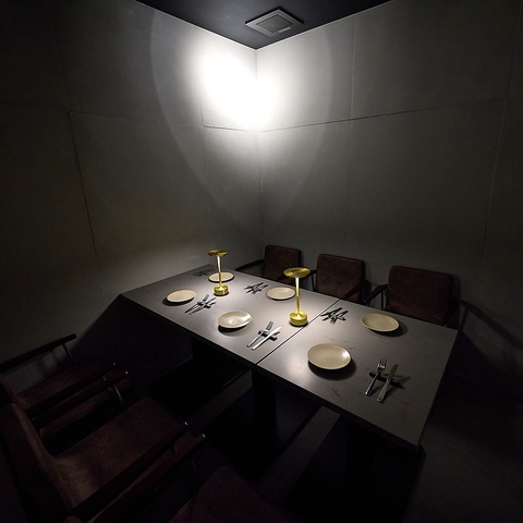 シックなグレーのテーブルが並ぶ個室は、落ち着いた雰囲気の中で食事を楽しみたい方におすすめです。テーブルを優しく照らすランプの光が、料理を一層引き立てます。大切な接待や顔合わせなど、プライベートな時間を過ごすのに最適な空間です。