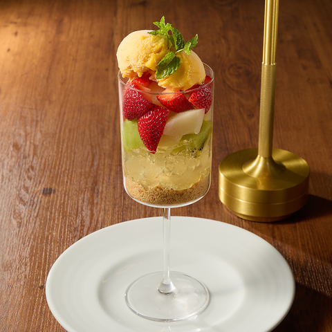 旬のフルーツをたっぷり使った、彩り豊かなグラスパフェ。フレッシュな甘みが口いっぱいに広がる、心弾む一品です。