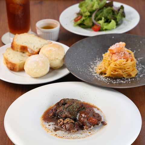 自家製の高加水パンを食べ放題で楽しめる贅沢ランチ。メインには、じっくり煮込んだ牛肉の赤ワイン煮込みを。さらに、本日のパスタと新鮮サラダ、ドリンクがセットになった満足感あるコースです。パンとの相性も抜群で、ゆったりとしたランチタイムにぴったり。