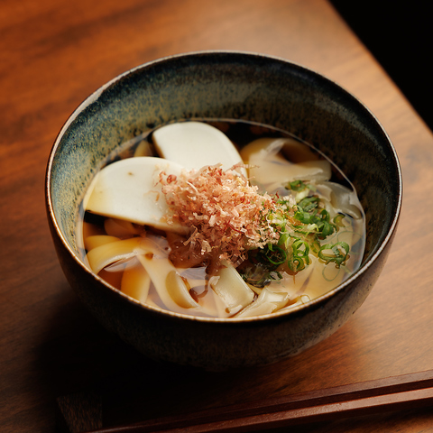出汁香る「温きしめん」は、名古屋名物の平打ちきしめんを当店ならではの優しい味わいに仕上げた一品です。コシのある平打ち麺が鰹と昆布の旨味を凝縮した出汁に絡み、口に入れた瞬間に広がる香りと温かさが心と体をほっと癒してくれます。〆の一杯としてもおすすめで、どこか懐かしくも新しい味わいをぜひご堪能ください。