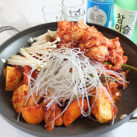 鶏肉とジャガイモ、人参などの野菜を、唐辛子入りのピリ辛いタレで煮込んだ韓国の鍋料理です。