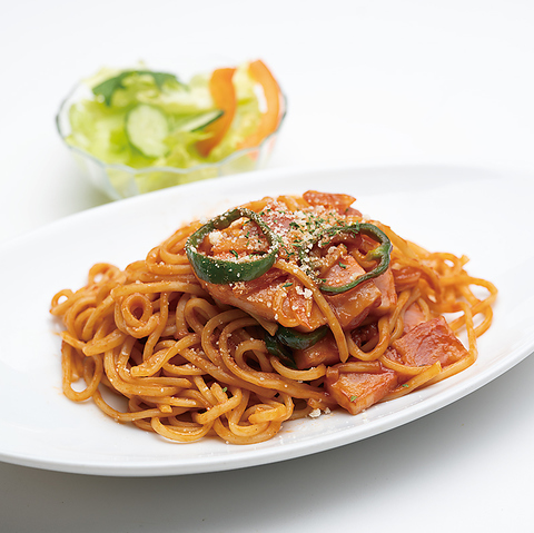 もちもち食感のパスタ♪/ベーコン、玉ねぎ、ピーマンを使用し、オリジナルソースで仕上げたパスタです。/ナポリタンセット1150円(税込)サラダ110円(税込)合計1260円(税込)