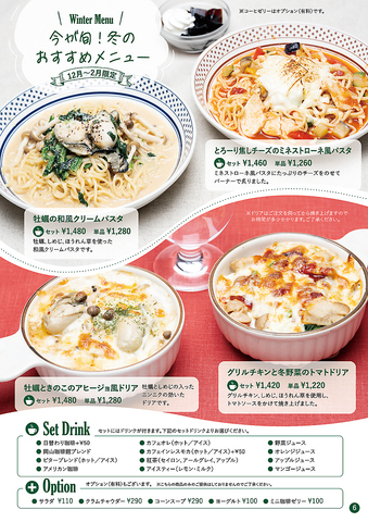 期間限定で冬の味覚を堪能できる特別メニューをご用意♪旨みたっぷりの牡蠣を使った和風クリームパスタやアヒージョ風ドリア★とろけるチーズが魅力のミネストローネ風パスタ、さらにグリルチキンと冬野菜のトマトドリアなど心も体も温まるラインナップです!寒い季節にぴったりの贅沢なひとときをお楽しみください♪