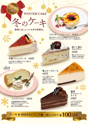 12月から2月までの期間限定「冬のケーキ」フェア♪濃厚なチョコレートケーキや極上チーズケーキ、香ばしい半熟ブリュレケーキ、栗の風味豊かなモンブランなど、季節感あふれるスイーツをご用意しました!珈琲と一緒に心も体も温まるひとときをお楽しみください!