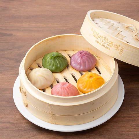 当店自慢の「五色小籠包」!「エビ(ピンク)」「豚肉(白)」「フカヒレ(オレンジ)」「鶏肉(緑)」「牛肉(紫)」と五種類の味が楽しめます!一度は食べて頂きたい一品です。色鮮やかな小籠包は写真映え間違いなし!